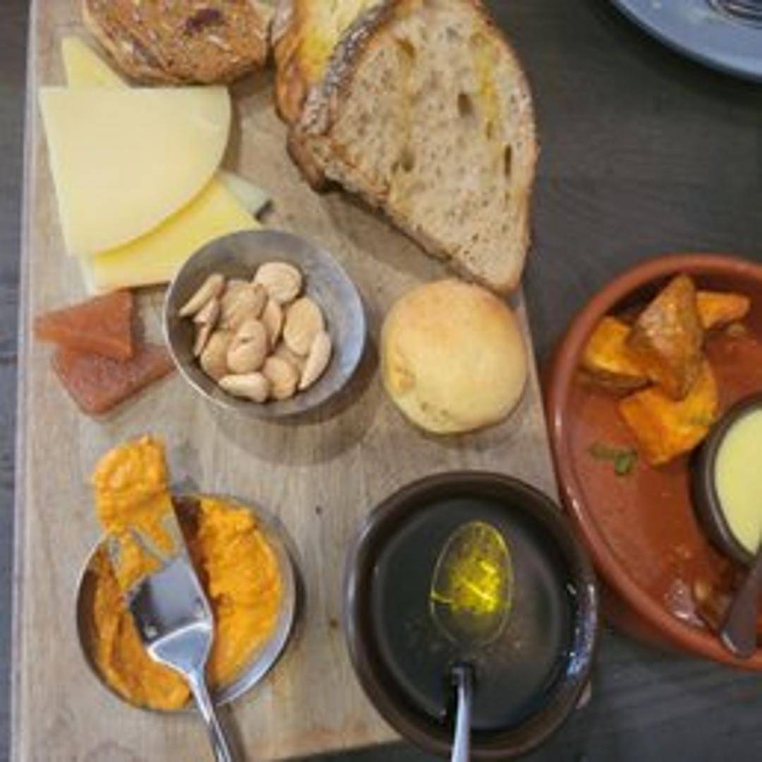 An exquisite assortment of freshly baked artisan breads, sourced from local purveyors, offering a delightful variety of textures and flavors. This plate is thoughtfully accompanied by a selection of house-made spreads, such as creamy cultured butter, vibrant herbed olive oil, and a unique Latin-inspired dip, perfect for starting your meal.