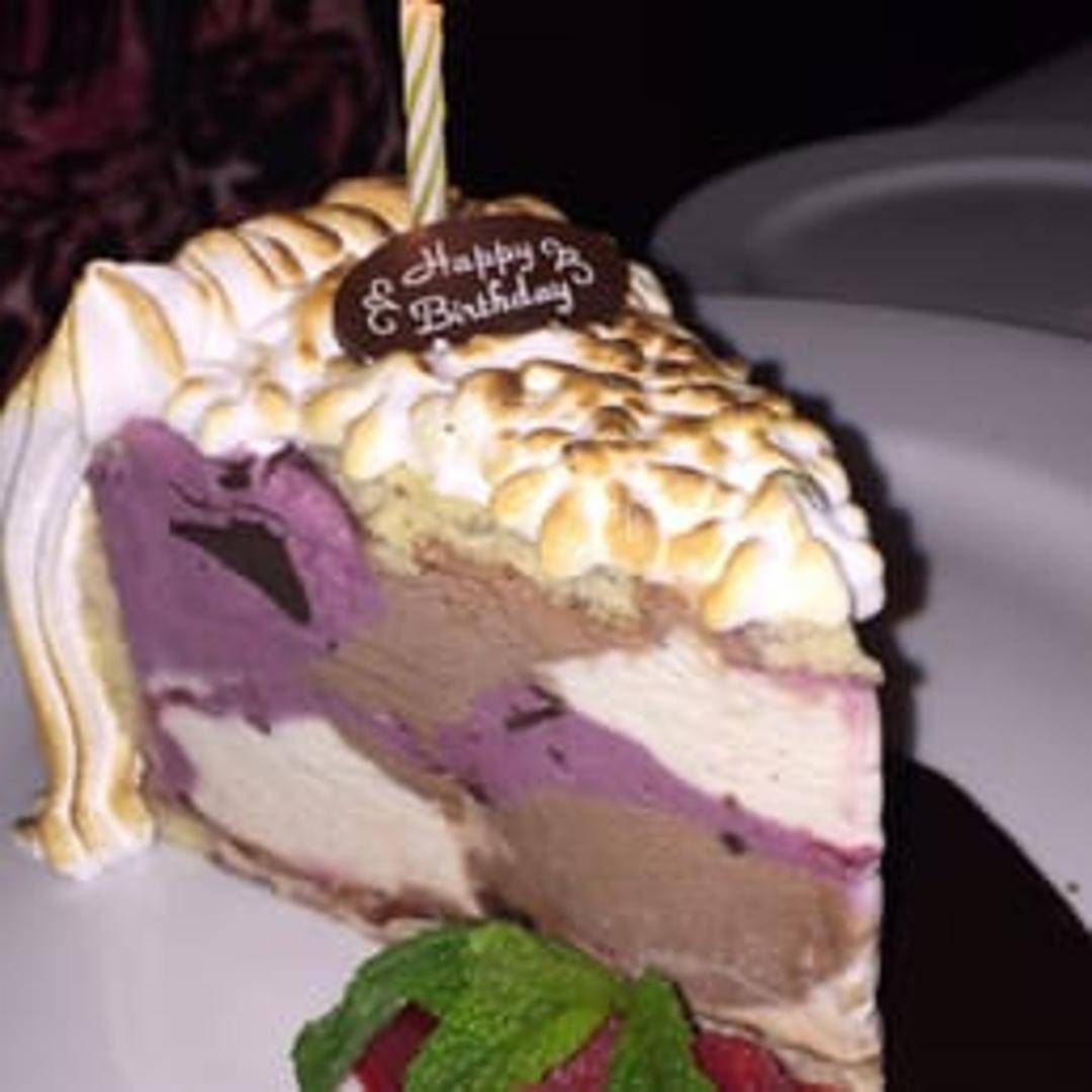 A show-stopping dessert featuring layers of moist sponge cake and rich ice cream, all encased in a dramatic meringue shell. The meringue is lightly torched to a golden perfection, creating a delightful contrast between its warm, toasted exterior and the chilled, creamy ice cream within.