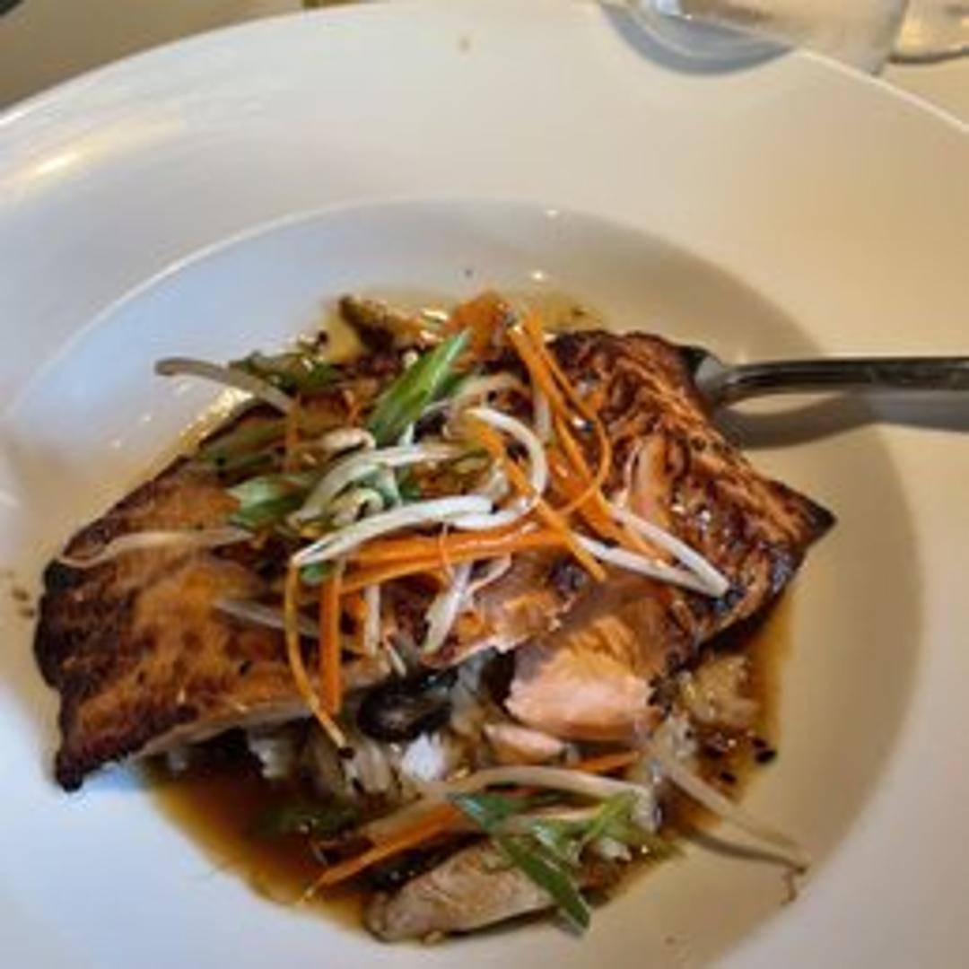 A perfectly cooked salmon fillet, glazed with a rich, savory-sweet teriyaki sauce. The tender, flaky salmon is complemented by the umami notes of the teriyaki, creating a balanced and flavorful dish that is both satisfying and light.
