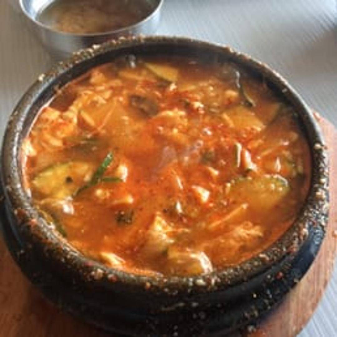 A spicy and comforting Korean stew made with silken tofu, vegetables, and your choice of protein (seafood, beef, pork, or vegetarian). Served bubbling hot in a stone bowl, often with a raw egg cracked into it to cook in the broth. Includes a side of rice.