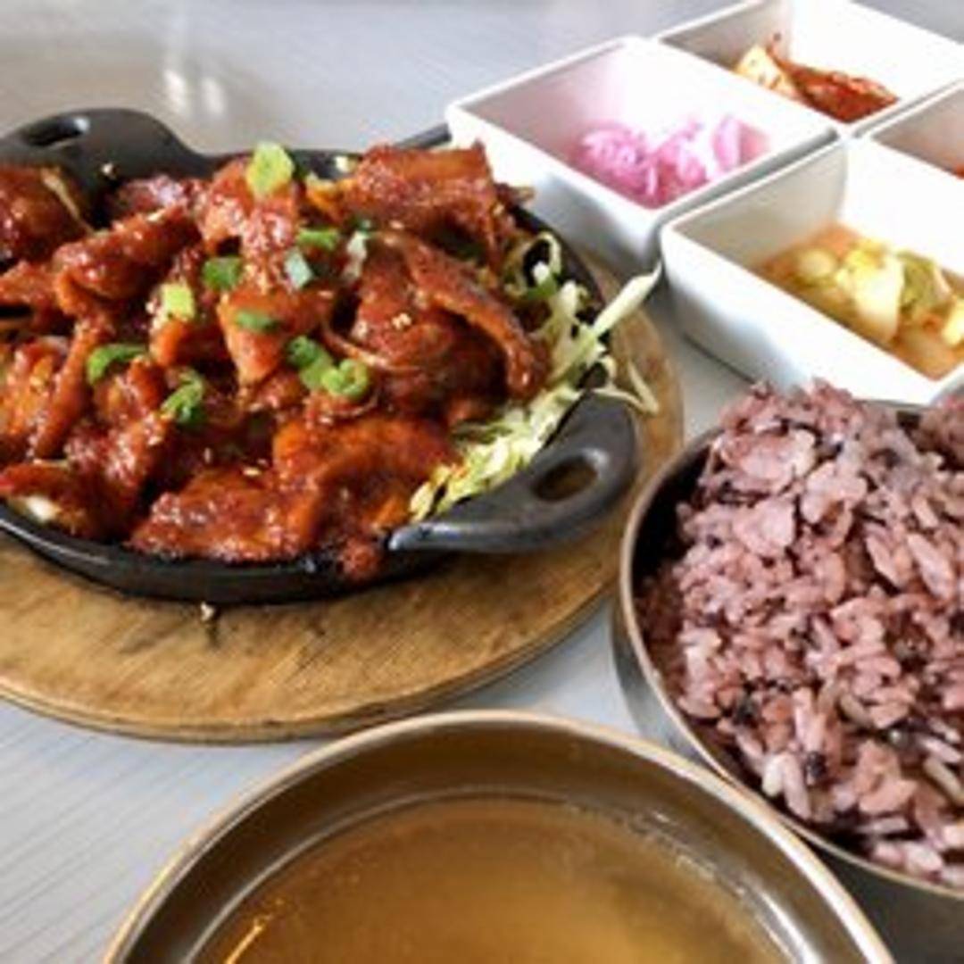 Tender pieces of chicken marinated in a fiery Korean chili paste-based sauce. Stir-fried with vegetables for a flavorful and spicy dish, perfect for those who enjoy a kick.