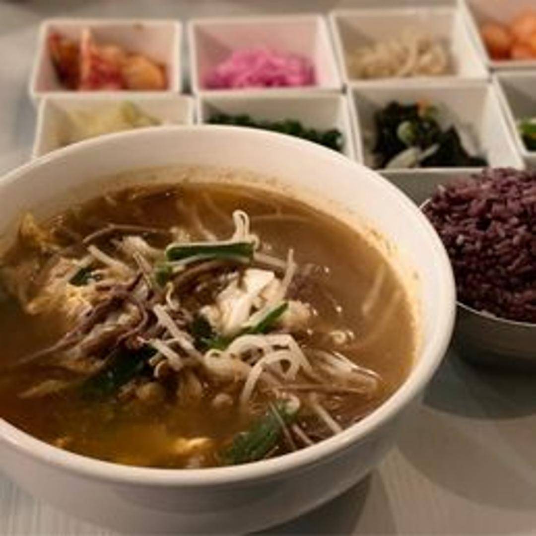 A hearty and robust Korean soup featuring shredded beef, vegetables, and clear noodles in a spicy, flavorful broth. A warming and satisfying meal.