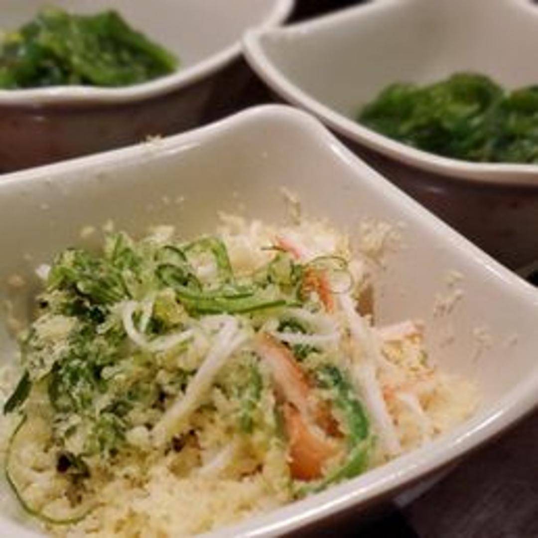 A vibrant and flavorful salad featuring marinated seaweed with a spicy kick. Often includes sesame seeds and chili flakes for added texture and heat.