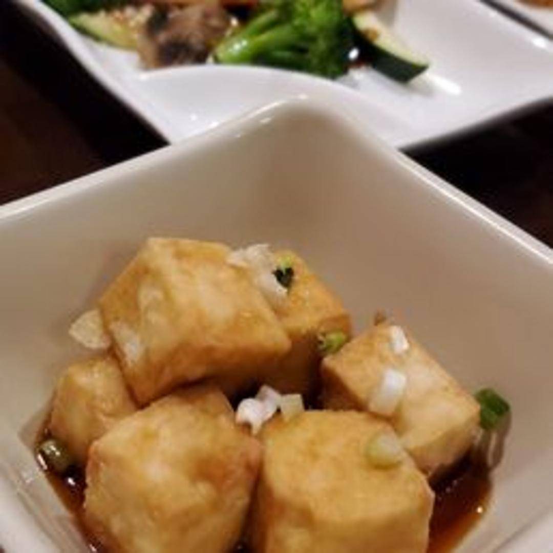 Lightly fried tofu, crispy on the outside and soft inside. Served with a flavorful dashi broth and garnished with scallions and grated daikon.