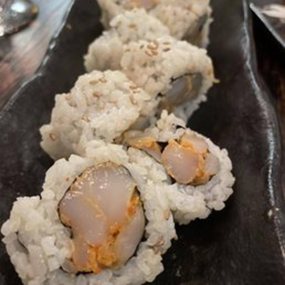 Sushi roll featuring succulent scallops blended with a spicy mayonnaise or chili sauce. Typically includes cucumber or avocado for texture and balance. Wrapped in seaweed and sushi rice, often topped with sesame seeds.