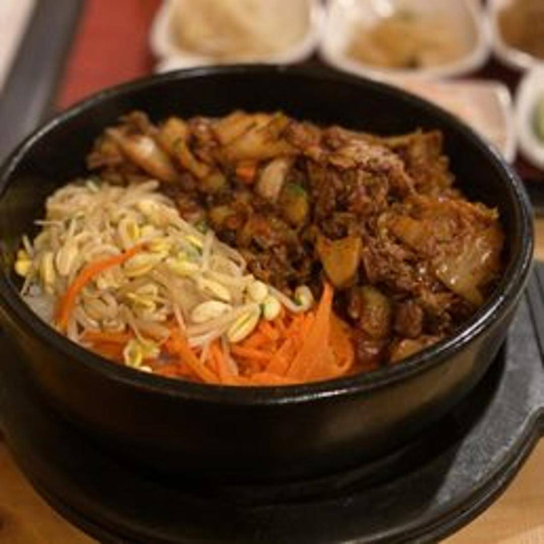 A Korean mixed rice dish served in a hot stone bowl (dolsot). Topped with an assortment of seasoned vegetables, marinated beef, a fried egg, and gochujang (red pepper paste). The hot stone bowl creates a crispy layer of rice at the bottom.