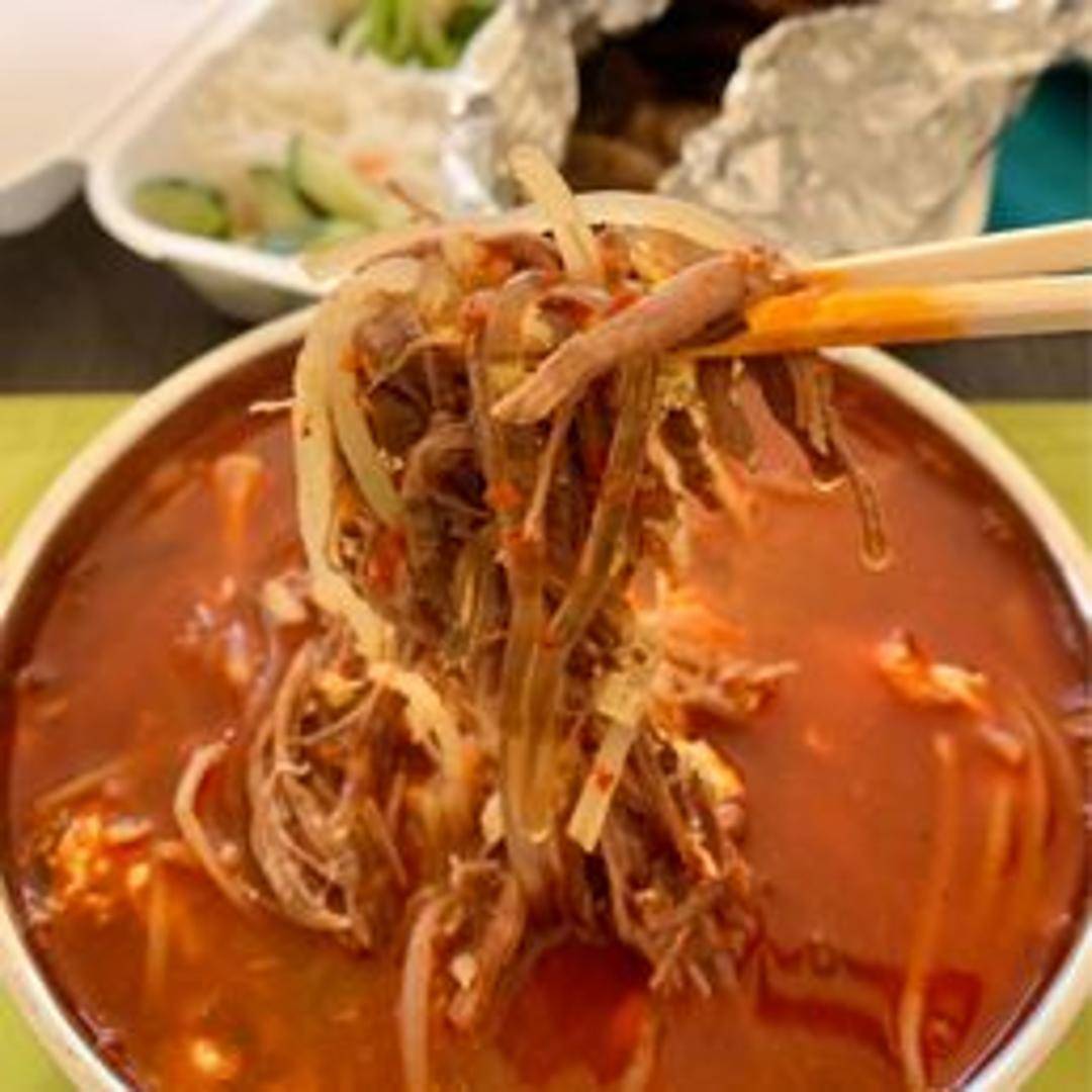 A hearty and spicy Korean beef soup. Shredded beef is simmered in a rich, vibrant broth with gosari (fiddlehead ferns), bean sprouts, scallions, and other vegetables. A robust and flavorful soup perfect for a cold day.
