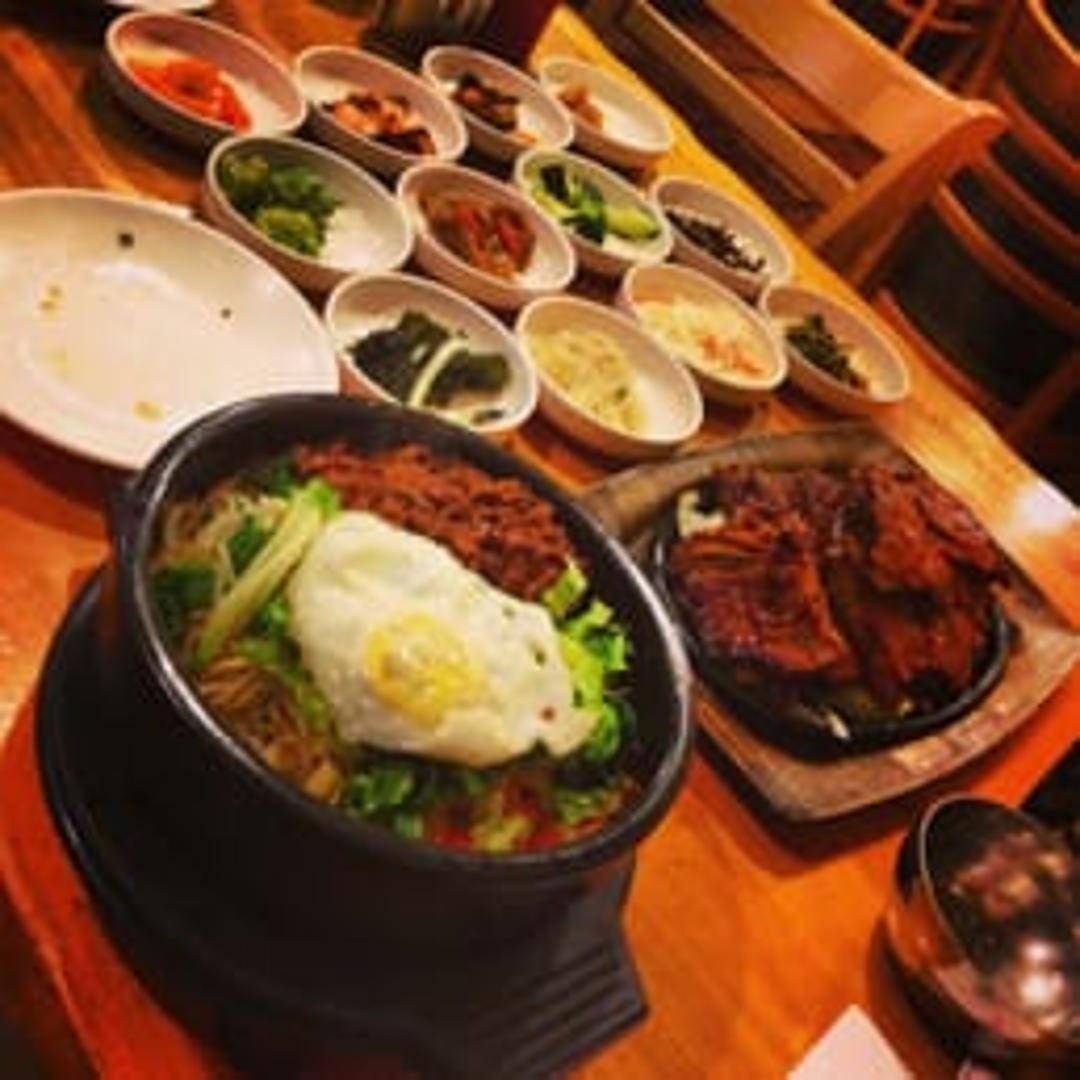 A colorful Korean mixed rice dish. Includes a bed of warm rice topped with assorted seasoned vegetables (such as carrots, spinach, bean sprouts, and mushrooms), a fried egg, and your choice of protein (typically beef or tofu). Served with a side of gochujang (Korean chili paste) to mix in according to your preference, allowing for a customizable level of spiciness and flavor.