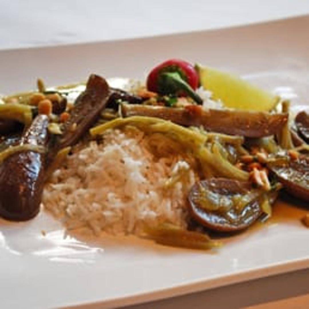 A flavorful and aromatic green curry featuring locally sourced eggplant simmered in a creamy coconut milk-based sauce. Served with jasmine rice. A vegetarian delight offering a balance of spice and savory notes.