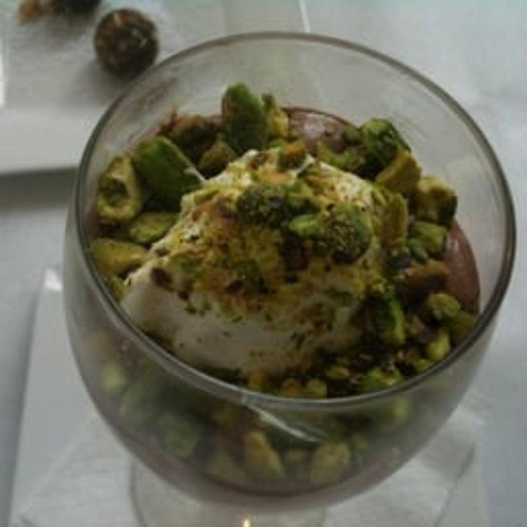 A layered dessert featuring rich chocolate mousse, crunchy pistachios, and light whipped cream. Expect a harmonious blend of textures and flavors, perfect for a sweet treat.