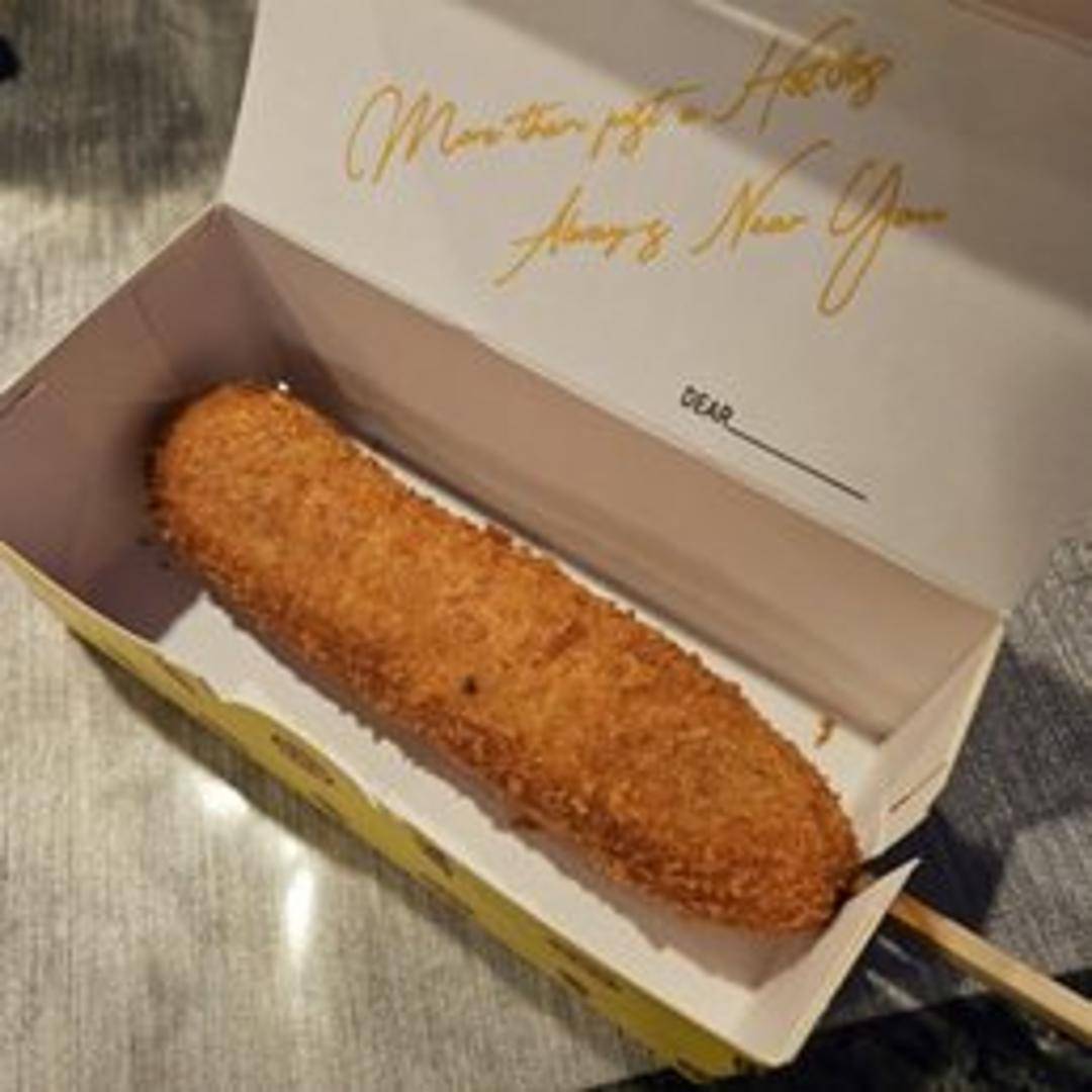 A hot dog coated in a thick layer of cornmeal batter and deep-fried until golden brown. Often served on a stick for easy handling.
