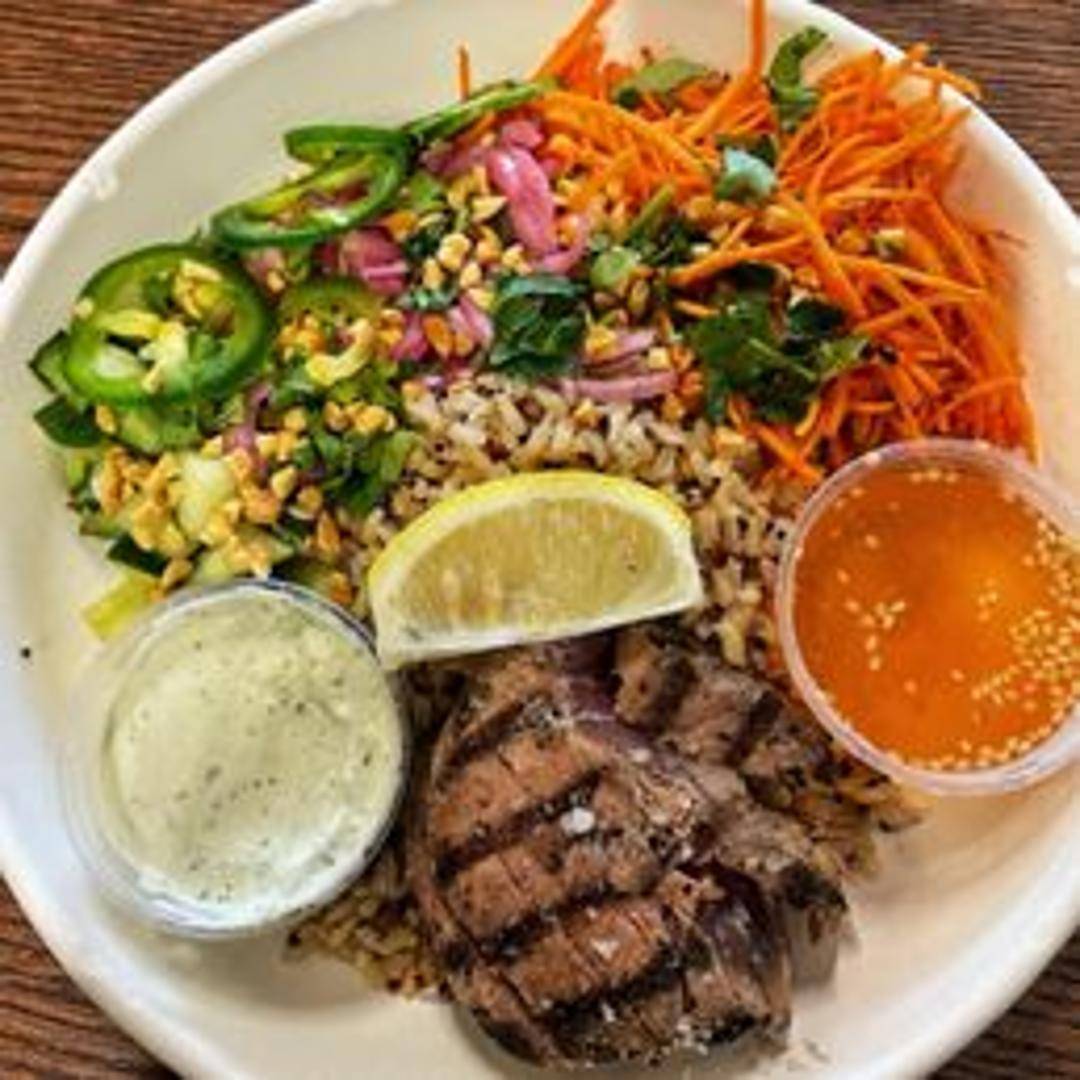 Seared tuna steak with a vibrant lemongrass marinade, served with your choice of base and toppings. Offers a light and flavorful option with Asian-inspired flavors.