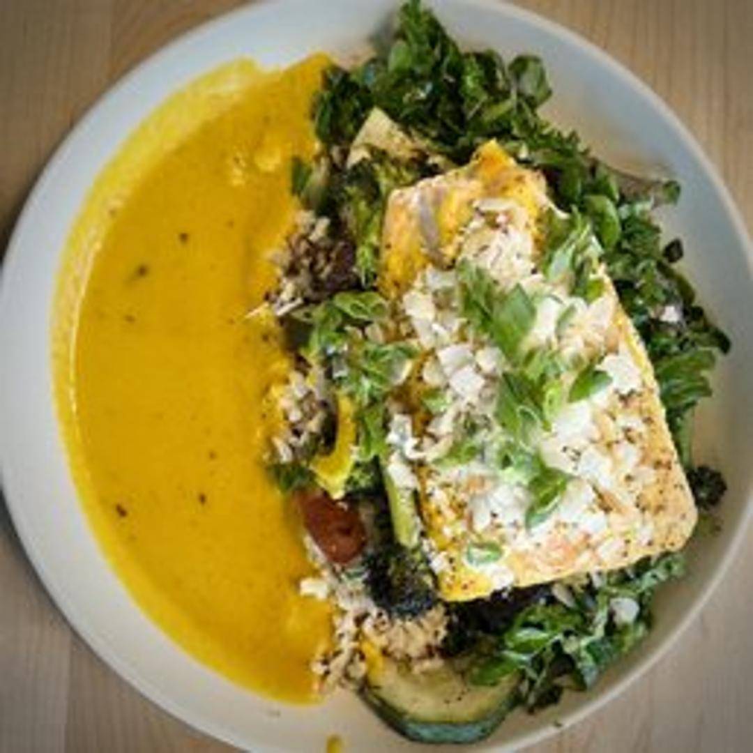 Flaky grilled salmon glazed with a fragrant curry sauce. Served with a bed of ancient grains and a medley of seasonal roasted vegetables.