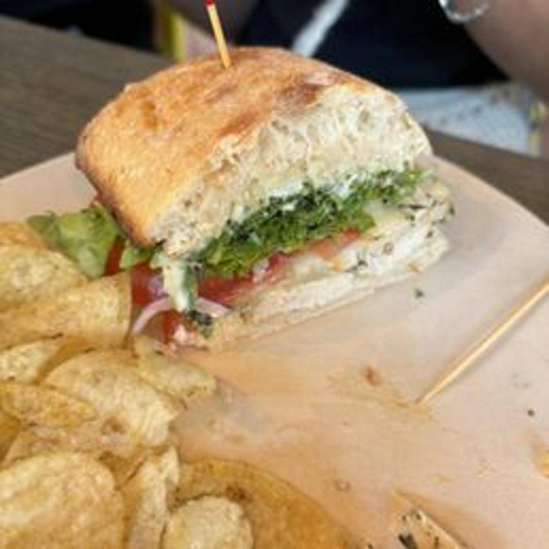 Tender grilled chicken breast marinated in a vibrant basil pesto, offering a fresh and herbaceous flavor profile.