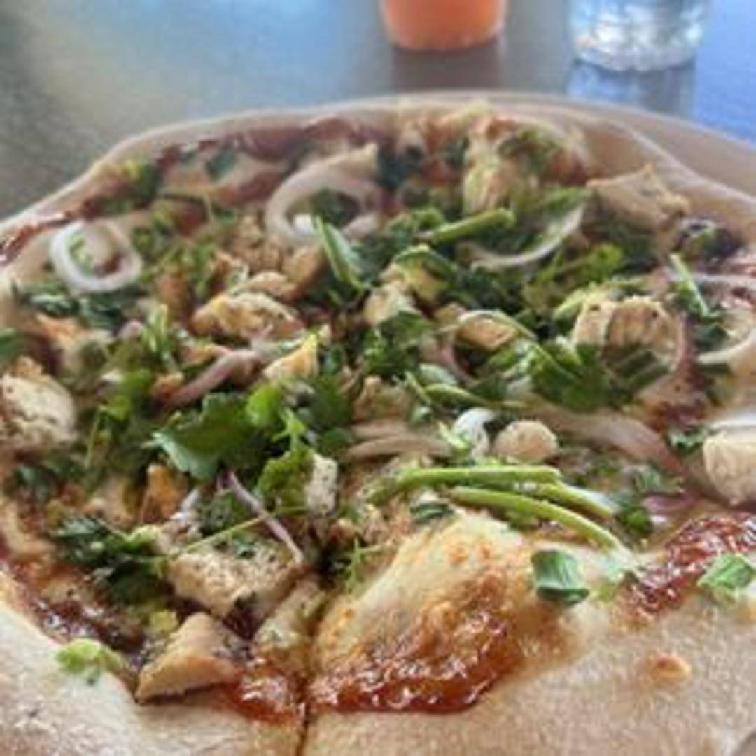 A savory pizza featuring a tangy BBQ sauce base, grilled chicken, red onions, mozzarella cheese, and a sprinkle of cilantro.