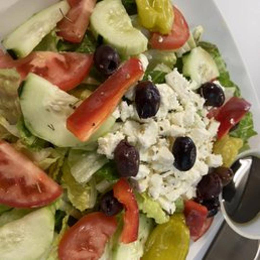 A refreshing mix of crisp romaine lettuce, tomatoes, cucumbers, red onion, Kalamata olives, and feta cheese. Tossed in a tangy Greek vinaigrette.
