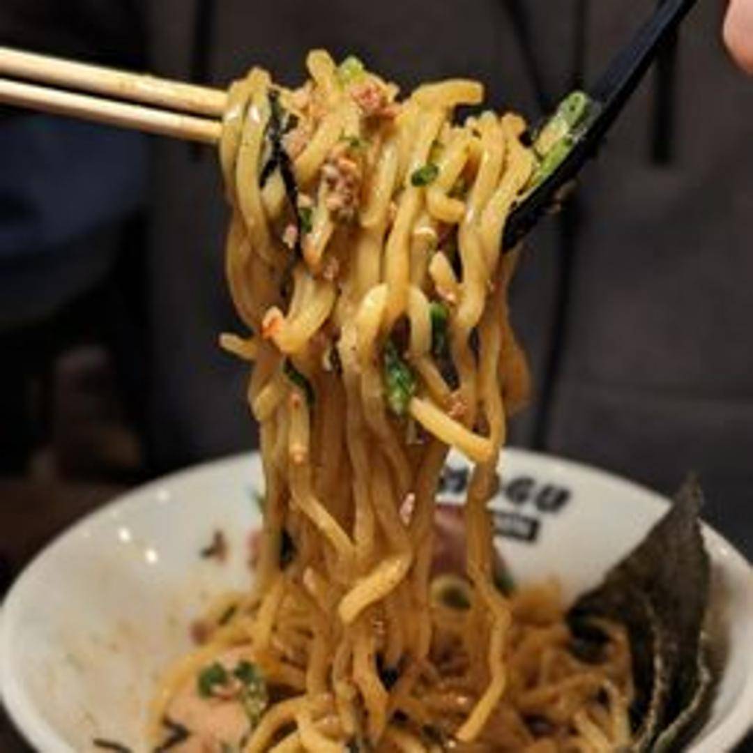 A savory and rich dry ramen dish featuring thick, chewy noodles tossed in a flavorful sauce. The "Deluxe" version includes a generous array of toppings such as seasoned ground pork (often miso-based), a soft-boiled egg (ajitama), chopped scallions, nori seaweed, bamboo shoots (menma), and potentially other additions like sesame seeds, chili oil, or a splash of vinegar for added complexity. The sauce is typically a blend of soy sauce, dashi, and other seasonings, creating a deeply umami experience. Instructions for mixing all ingredients thoroughly before consuming are generally provided.
