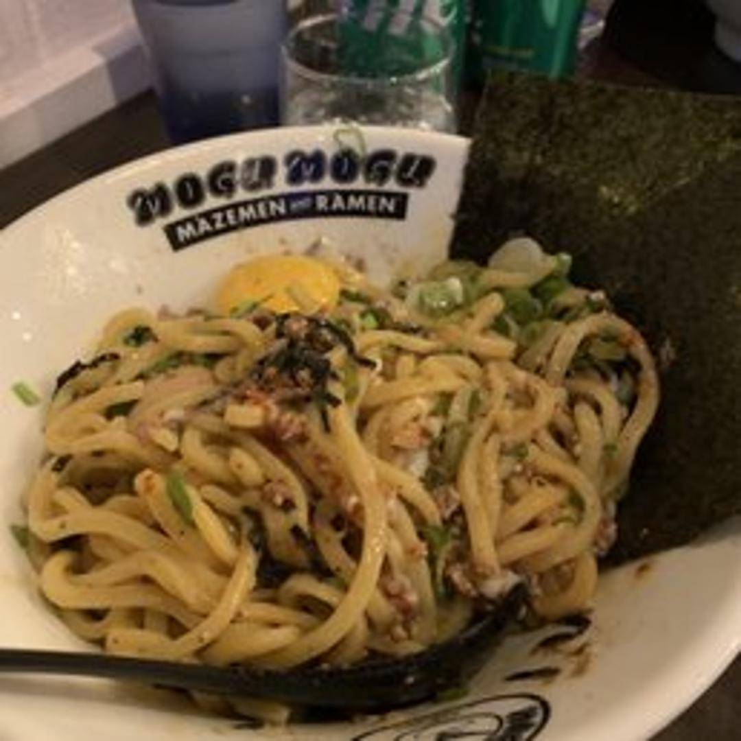A dry ramen dish with thick, chewy noodles tossed in a rich and savory sauce. Topped with a variety of flavorful ingredients, including ground pork, egg yolk, green onions, and nori. Mix well for an explosion of umami.