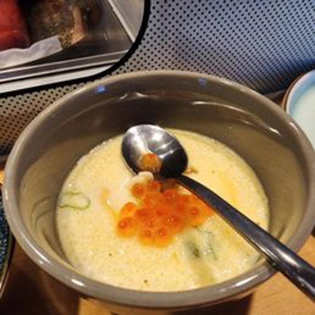 A savory, steamed egg custard, typically served hot in a small cup or bowl. It often contains ingredients like chicken, shrimp, mushrooms, ginkgo nuts, and fish cake, offering a delicate and comforting flavor.