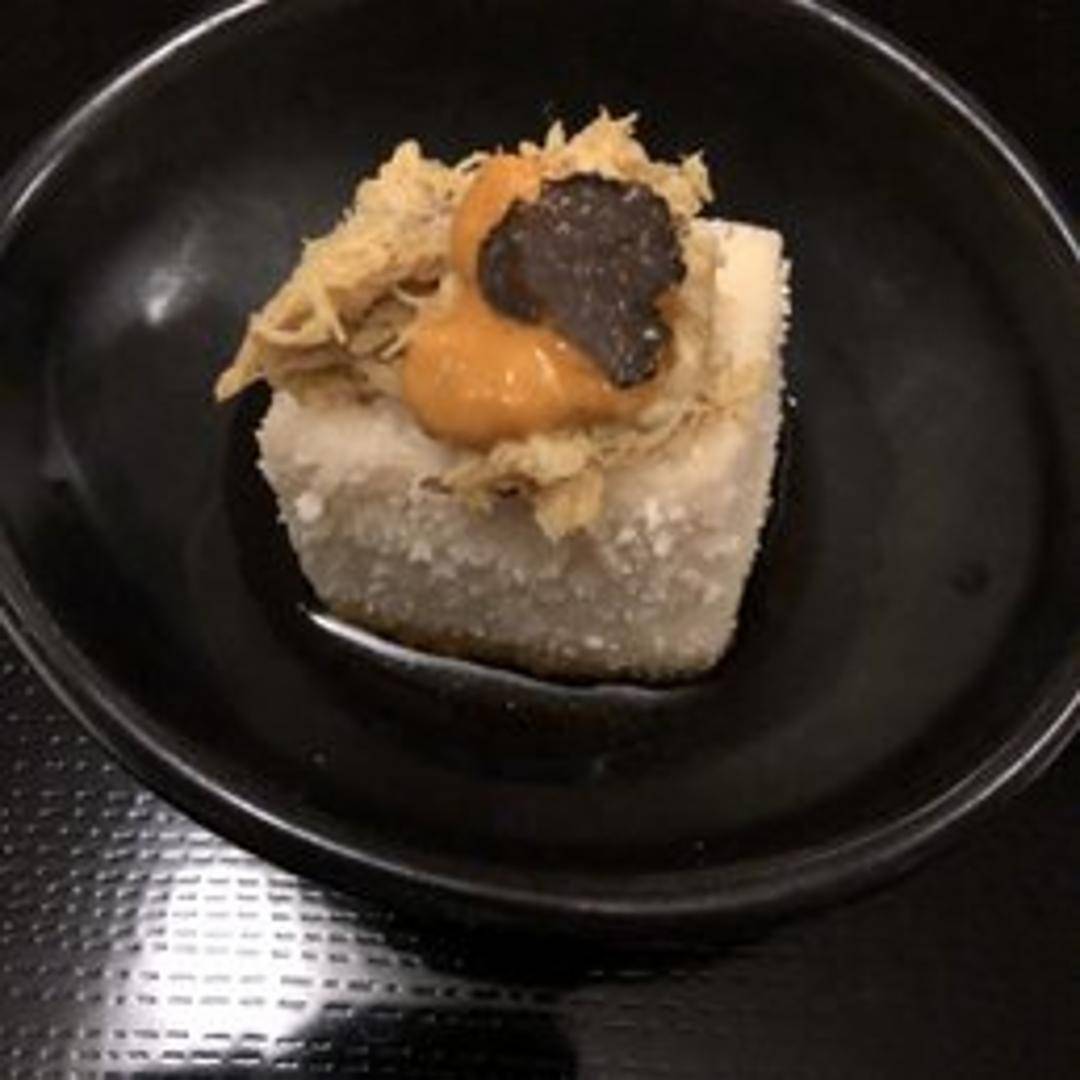 Delicate cubes of silken tofu, lightly coated in potato starch and deep-fried to a golden crisp. Served in a savory tentsuyu broth, garnished with grated daikon radish, ginger, and nori seaweed. The tofu is crispy on the outside and incredibly soft on the inside.