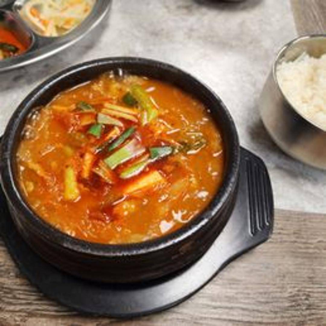 Spicy and savory stew made with fermented kimchi, pork belly (or tofu), scallions, and other vegetables in a flavorful broth.