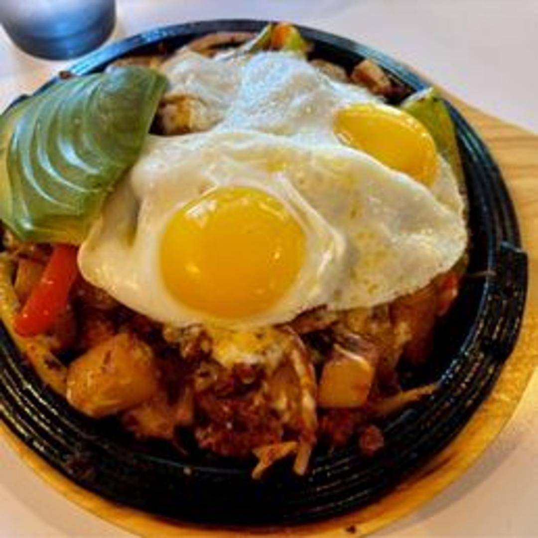 A hearty scramble of fluffy eggs and spicy Mexican chorizo. Blended with sauteed onions, bell peppers, and diced tomatoes. Served with warm tortillas and a side of refried beans.
