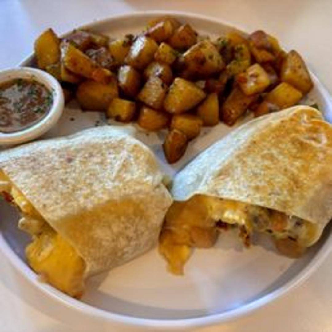 A hearty burrito filled with scrambled eggs, your choice of protein (bacon, sausage, or chorizo), potatoes, cheese, and pico de gallo. Wrapped in a warm flour tortilla.