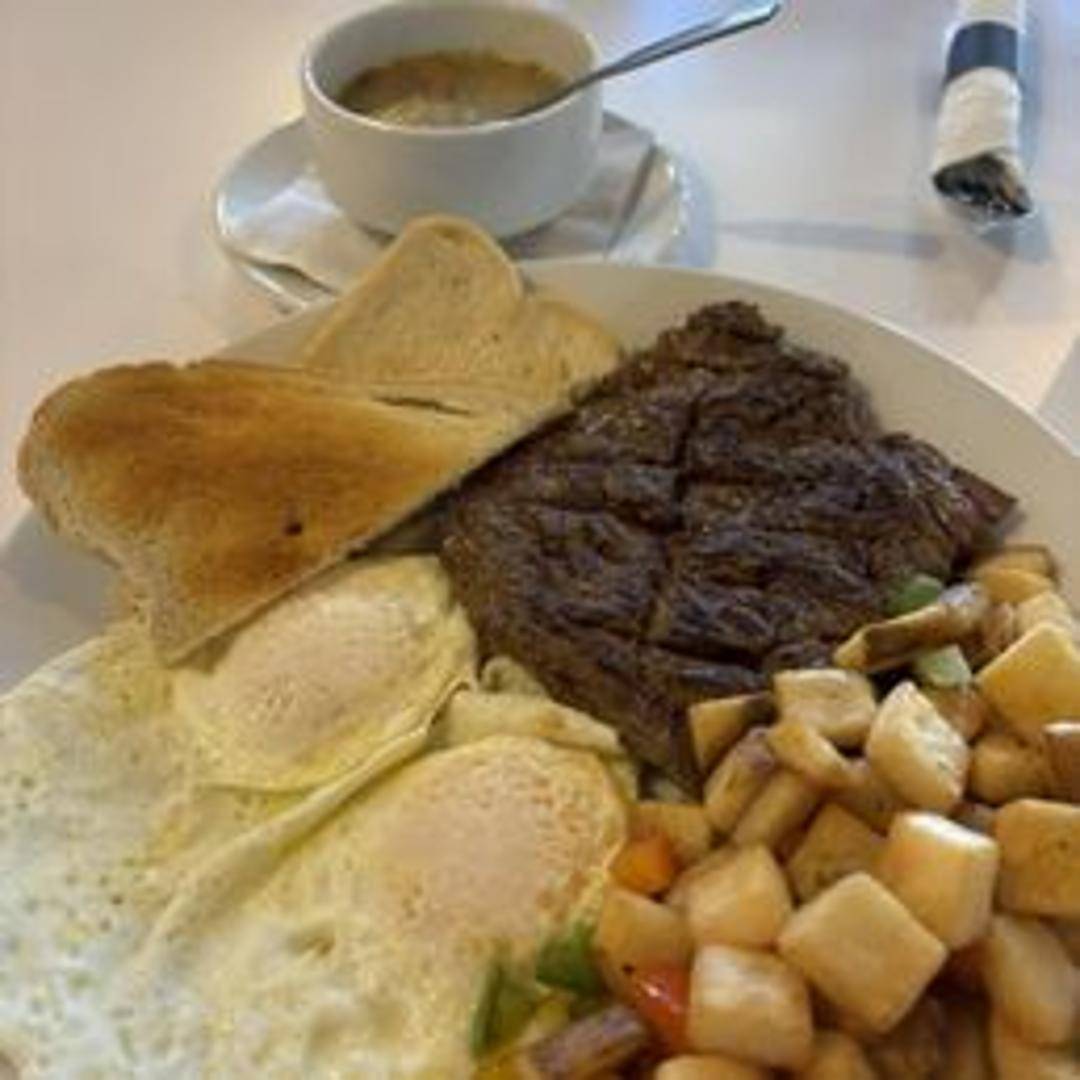Grilled steak cooked to your preference, served alongside two eggs prepared your way. Accompanied by crispy breakfast potatoes and a side of toasted bread.