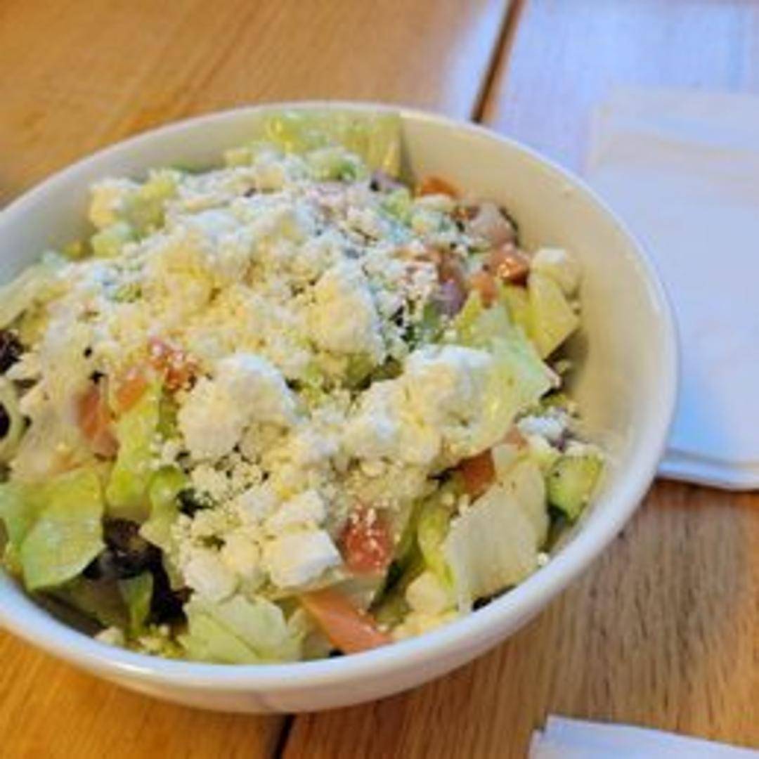 A Mediterranean delight with crisp romaine lettuce, ripe tomatoes, cucumbers, Kalamata olives, red onion, and feta cheese, drizzled with a light Greek vinaigrette.