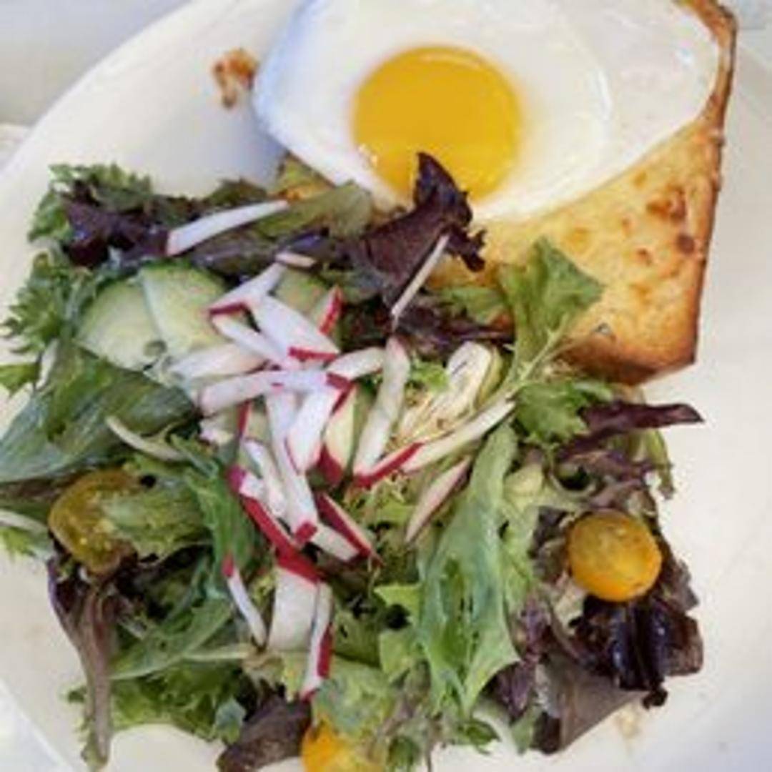 A classic French hot sandwich featuring grilled ham and Gruyère cheese, topped with a fried egg and creamy béchamel sauce. Served with a side salad.