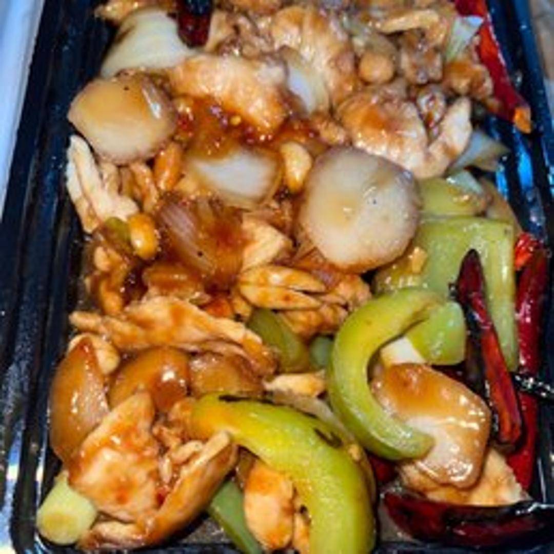 Diced chicken stir-fried with peanuts, dried chili peppers, and Sichuan peppercorns in a spicy and tangy sauce. Includes diced vegetables such as bell peppers and onions.
