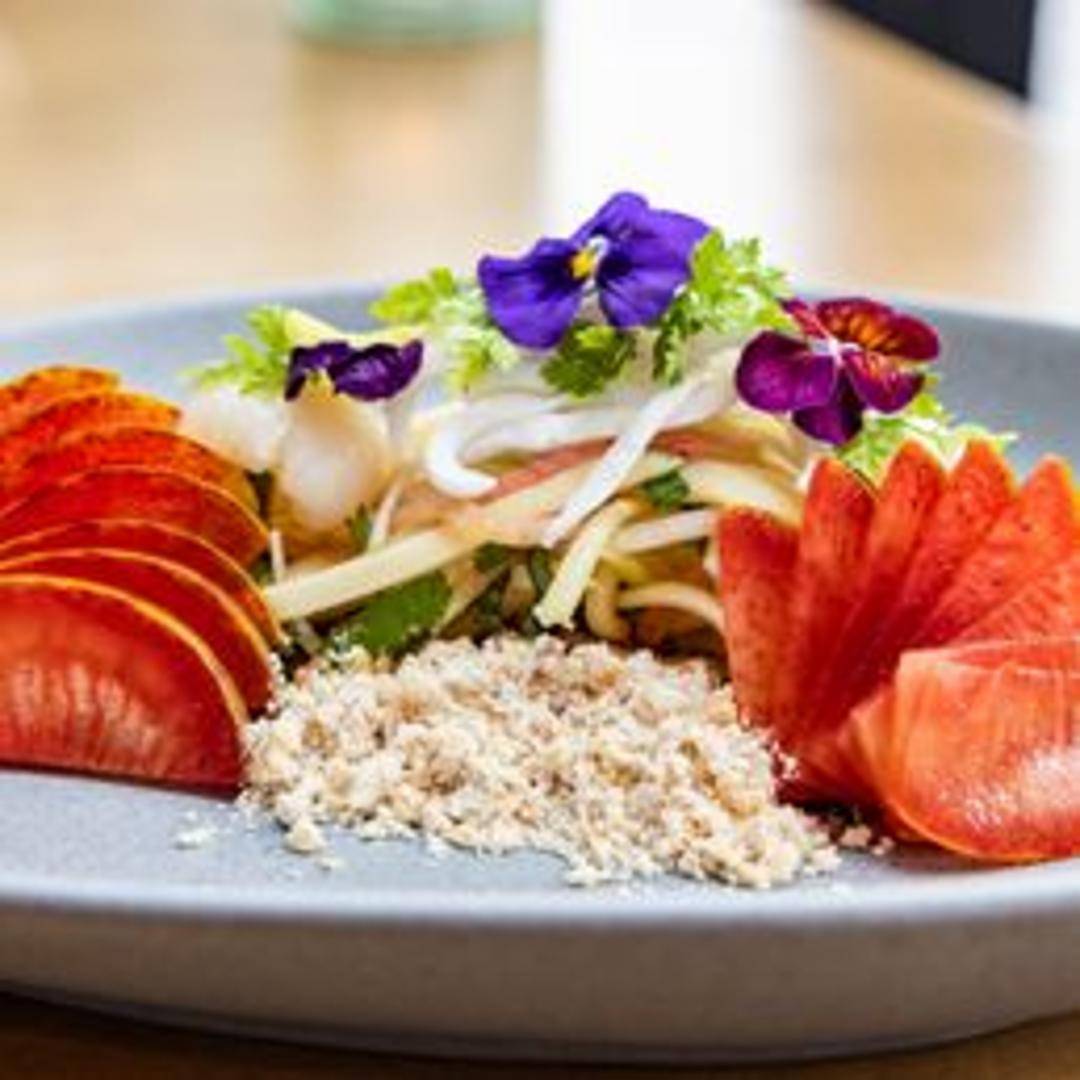 Refresh your palate with the vibrant 'Green Mango Salad,' a crisp and zesty composition featuring thinly sliced unripe mangoes. This bright salad is meticulously tossed with an assortment of fresh herbs, crunchy peanuts, and often a medley of other vegetables, all dressed in a tangy and savory vinaigrette that awakens the senses.