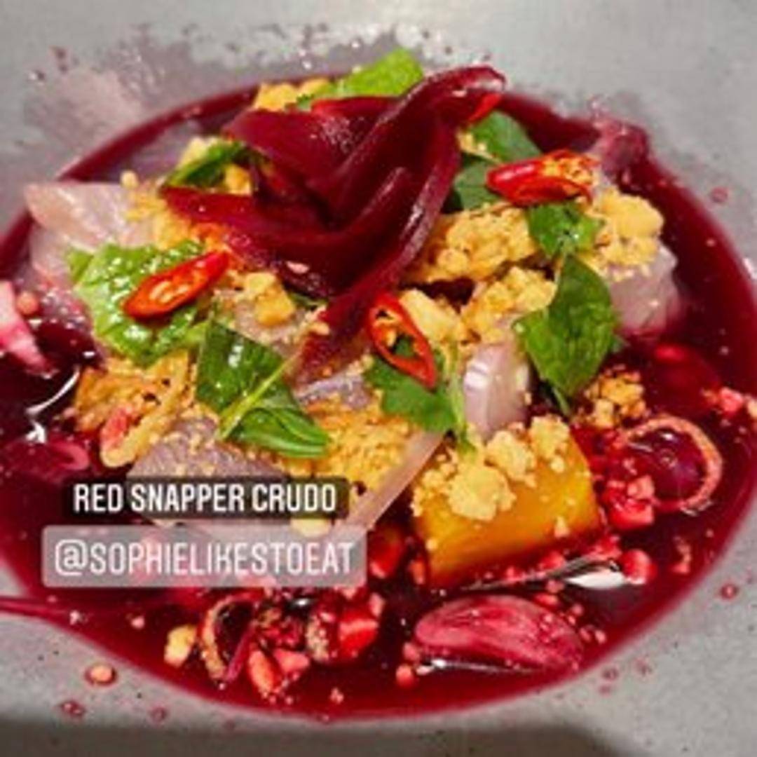 Delicately thin slices of fresh red snapper, artfully arranged and brightened with a vibrant, zesty dressing that highlights the fish's natural sweetness. This elegant crudo offers a refreshing start, balancing subtle flavors with a refined presentation.