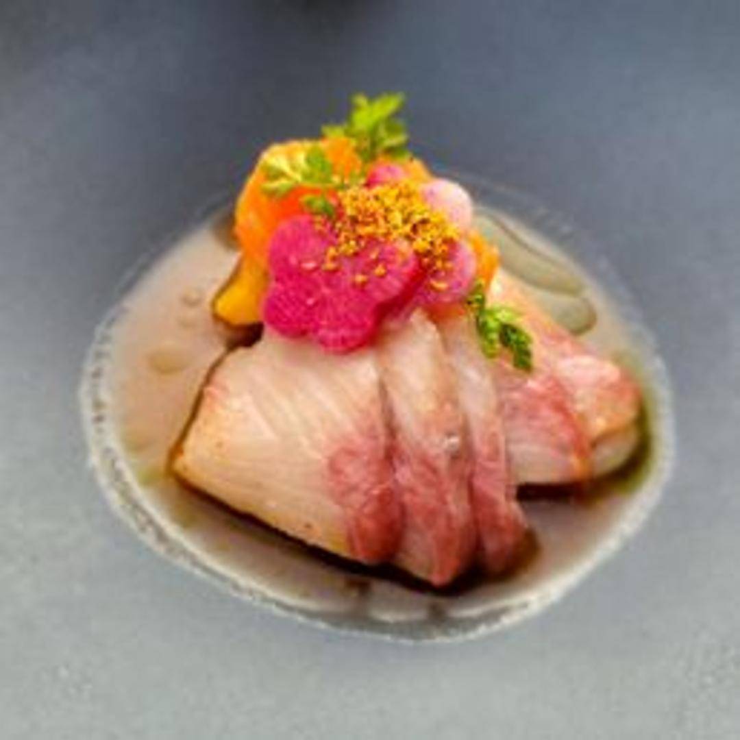 Exquisite slices of fresh Hamachi (Japanese yellowtail), presented raw and dressed with a delicate, bright sauce. This crudo highlights the fish's buttery texture and rich flavor, offering a sophisticated and refreshing culinary experience.