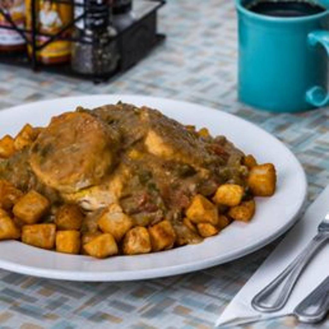 A hearty breakfast skillet with a base of potatoes, topped with your choice of meats, sauteed veggies, and two eggs cooked to your liking. Includes your choice of toast or biscuits.