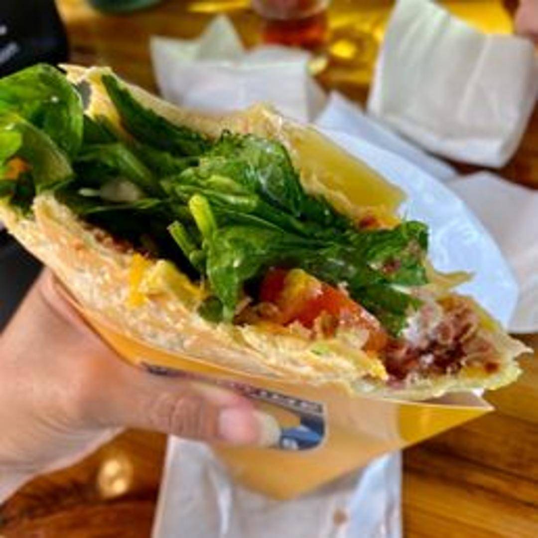 A substantial crepe filled with ham, swiss cheese, a fried egg, and a side of hollandaise sauce.