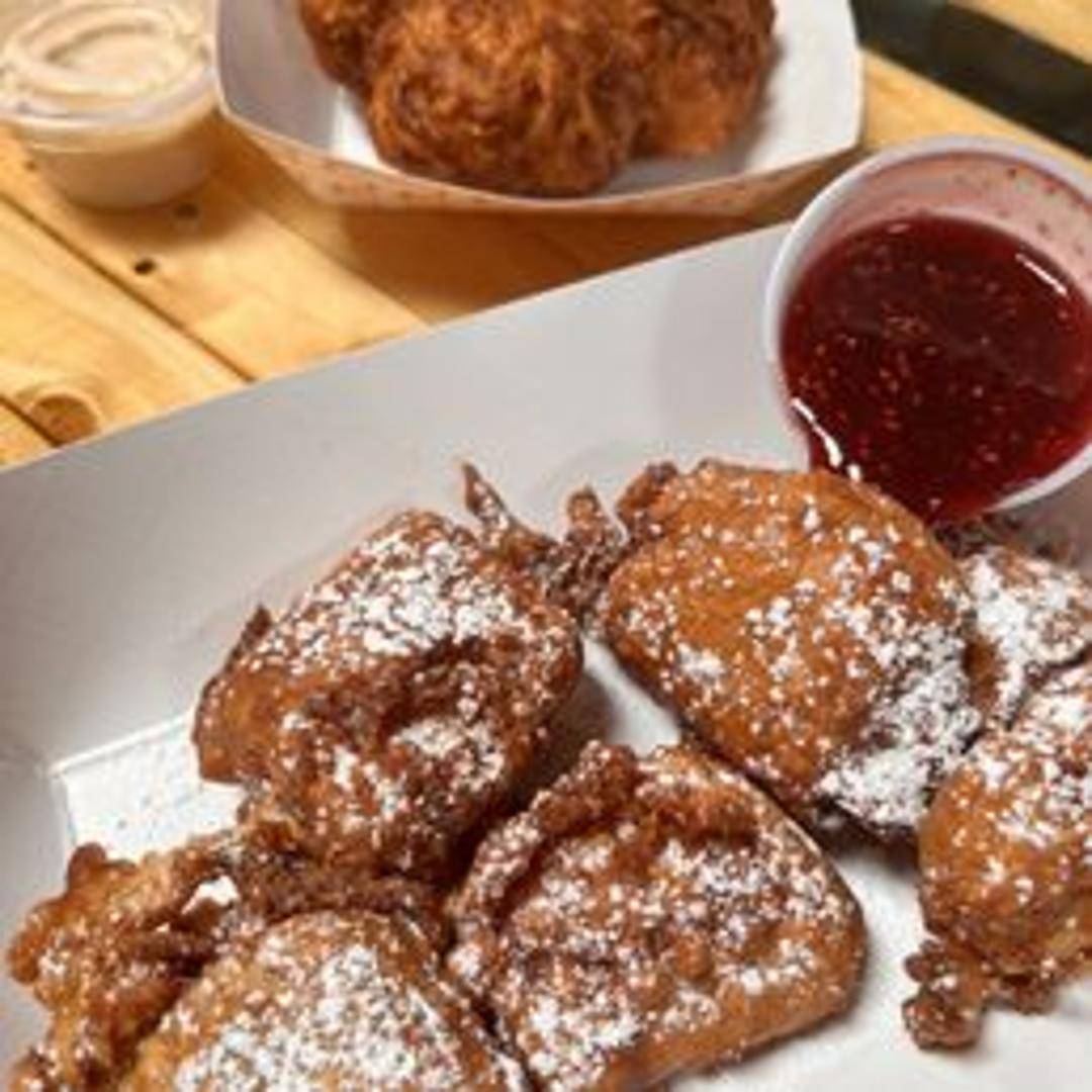 A sweet and savory crepe filled with ham, swiss cheese, dipped in batter, fried to golden perfection, and dusted with powdered sugar, served with a side of raspberry jam.