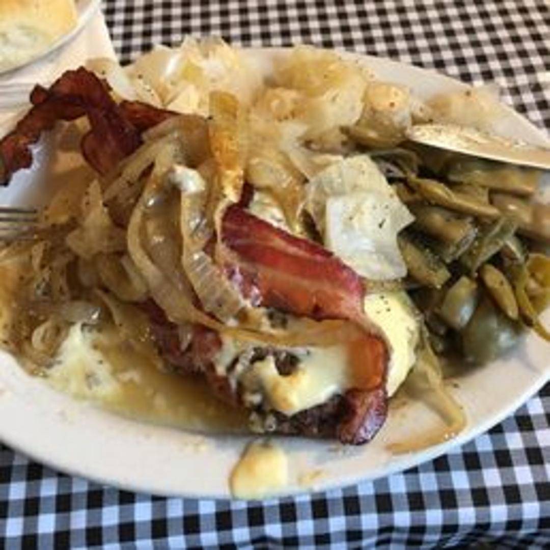 A hearty, grilled hamburger steak, seasoned to perfection and cooked to your liking. Smothered in savory brown gravy, it's a comforting Southern favorite that tastes just like home.