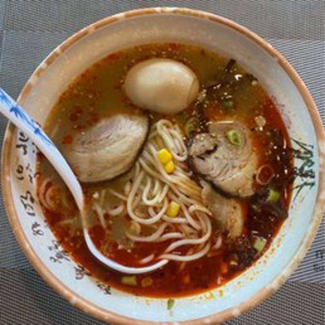 A rich and savory ramen featuring a creamy pork bone broth (tonkotsu) simmered to perfection. Tender slices of slow-braised pork belly are artfully arranged atop the noodles, along with traditional ramen toppings such as a soft-boiled egg, scallions, nori seaweed, and may include other seasonal vegetables.