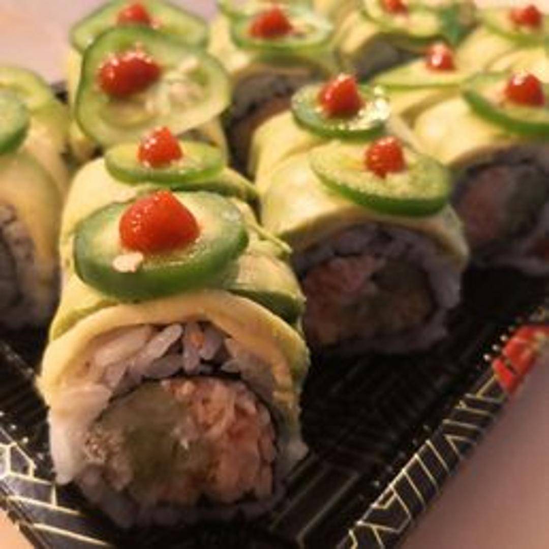 A vibrant and flavorful sushi roll featuring a spicy blend of fillings. Typically includes shrimp tempura, avocado, and spicy mayo, often topped with tuna, jalapeño, and a drizzle of eel sauce. The combination offers a delightful mix of creamy, crunchy, and spicy sensations with a hint of sweetness.