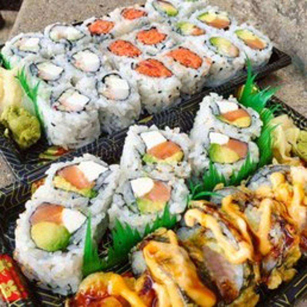 A sushi roll featuring tempura shrimp, cream cheese, and avocado, rolled in rice and seaweed. Topped with spicy mayo and eel sauce, then sprinkled with tempura flakes. Offers a creamy, crunchy, and slightly spicy flavor profile.