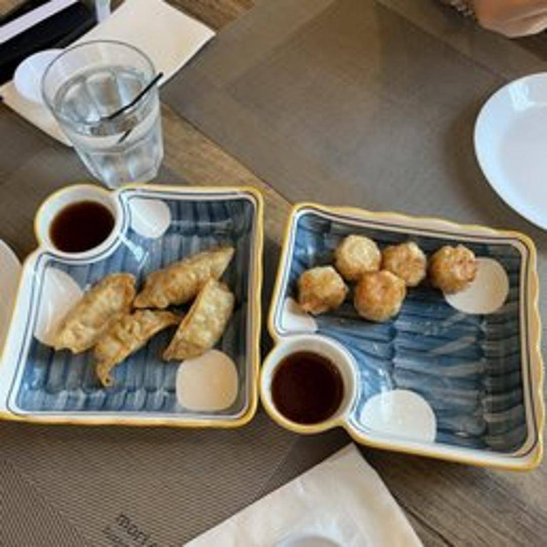 Pan-fried Japanese dumplings filled with a savory mixture of ground pork, finely chopped vegetables (such as cabbage, chives, and ginger), and seasonings. Served with a traditional dipping sauce of soy sauce, rice vinegar, and chili oil.