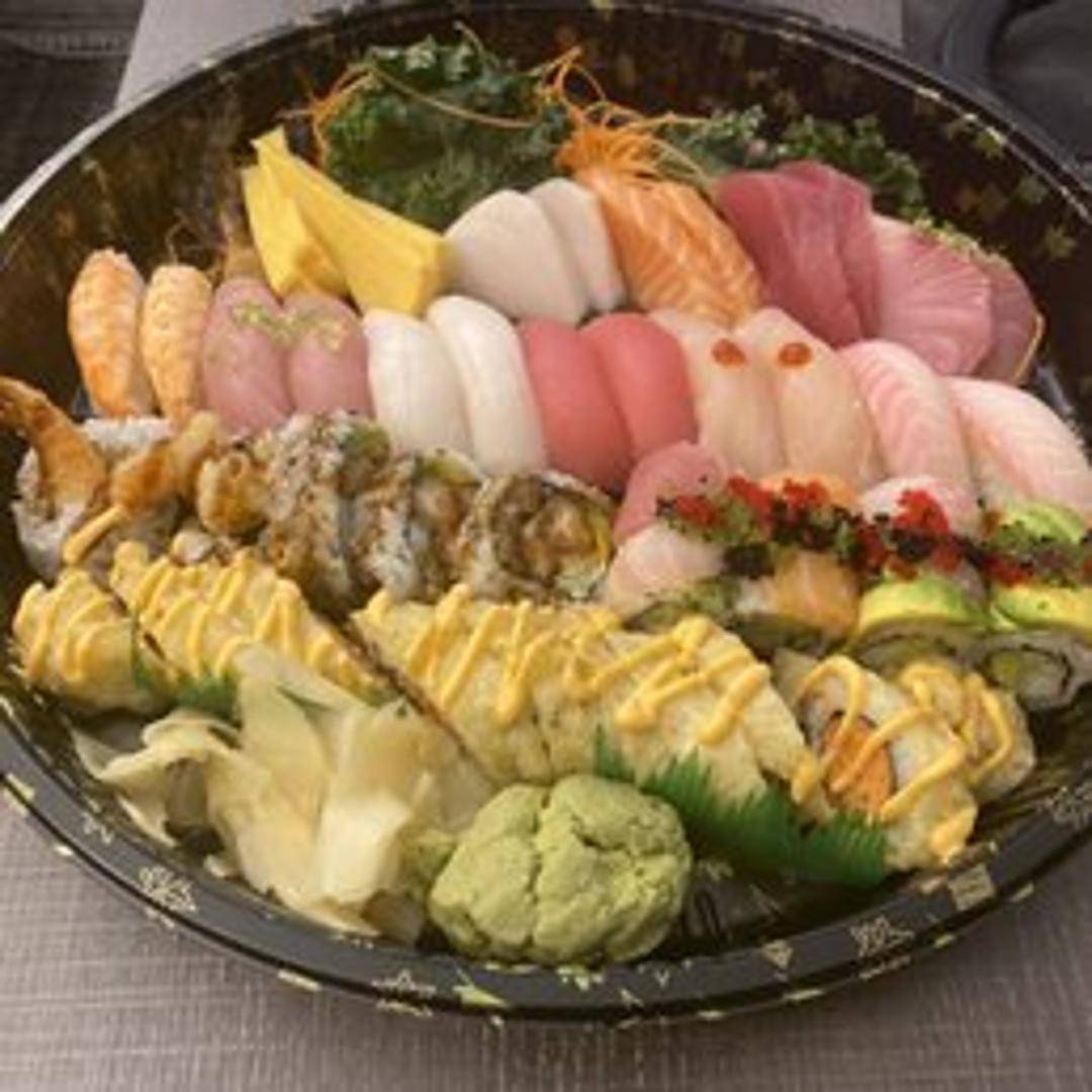 A delightful assortment of assorted sushi and sashimi, artistically arranged. This selection typically includes a variety of fresh fish, such as tuna, salmon, and yellowtail, along with California rolls and other chef's choice sushi rolls. Perfect for sharing and experiencing a range of flavors and textures.