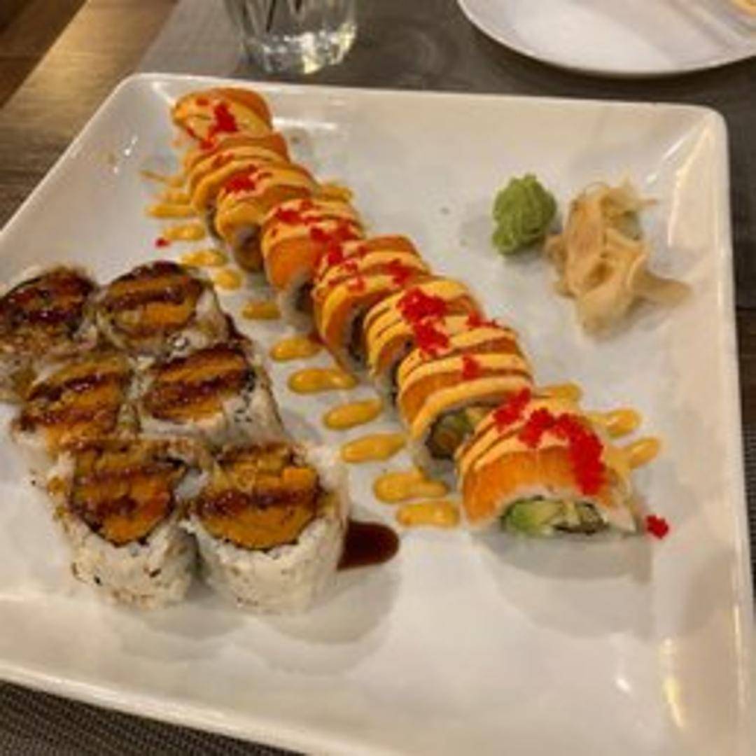 An ocean-inspired roll showcasing fresh seafood and vibrant colors. Contains [insert specific ingredients here, e.g., shrimp tempura, crab, mango] and is beautifully garnished with [insert topping details, e.g., seaweed salad, tobiko]. A visually appealing and delicious choice.