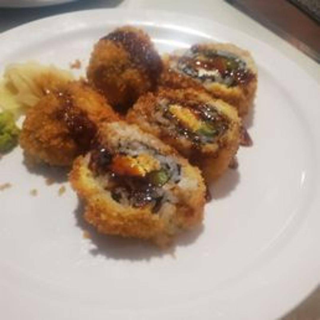 A unique Moshi Sushi Bar creation. This specialty roll offers a delightful combination of smoked salmon, creamy avocado, and crisp cucumber, artfully topped with a special creamy sauce and a sprinkle of crunchy tempura flakes, delivering a rich and textural experience.