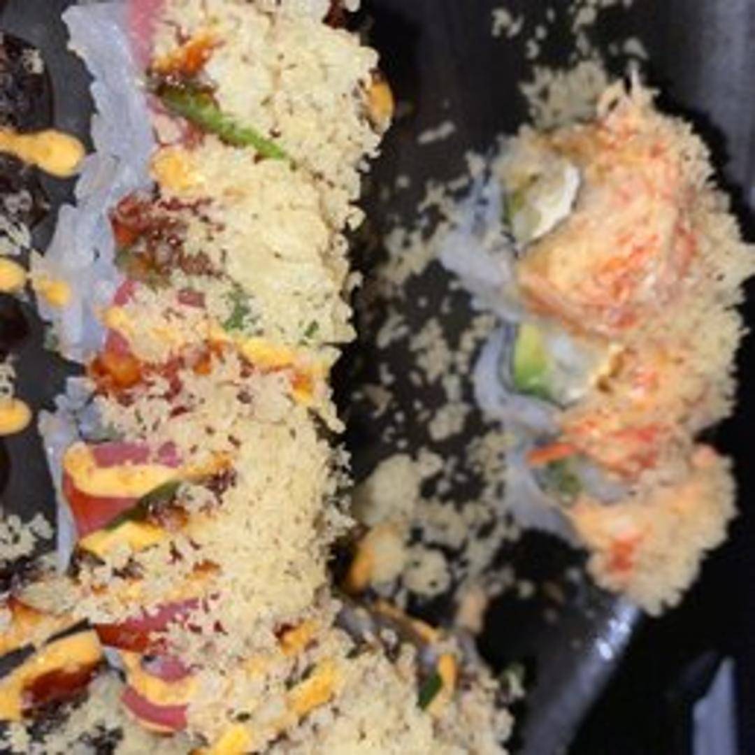 A signature specialty roll crafted with fresh spicy tuna and crisp cucumber, elegantly topped with slices of rich avocado and premium salmon. Finished with a delicate drizzle of our chef's special sweet chili sauce and a sprinkle of toasted sesame seeds for a unique flavor profile.