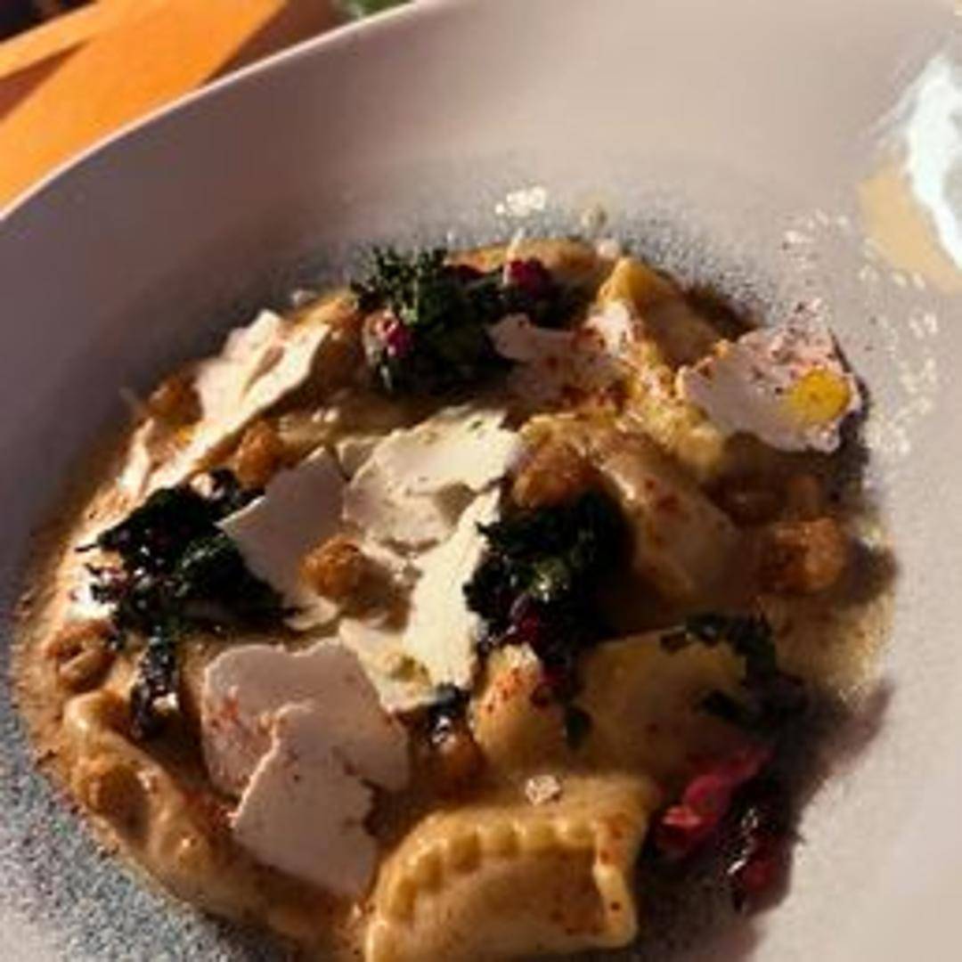 Delicate pasta pockets filled with sweet and savory roasted squash. Served with a light sauce, likely featuring browned butter and sage, highlighting the squash's natural sweetness and earthy notes. Expect a comforting and flavorful vegetarian option.