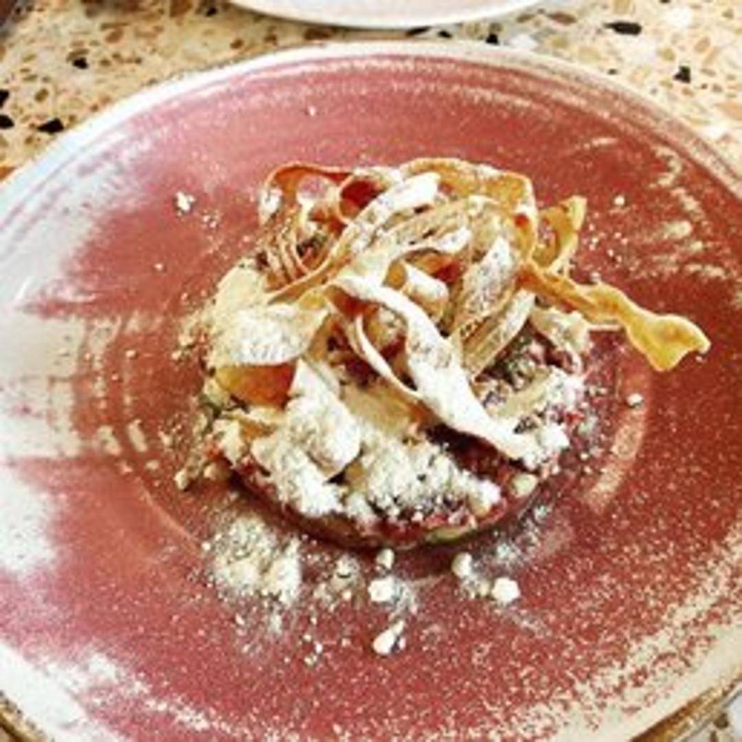 Finely minced raw beef, expertly seasoned and traditionally prepared. Served with classic accompaniments such as capers, onions, and a raw egg yolk, alongside grilled bread or crostini.