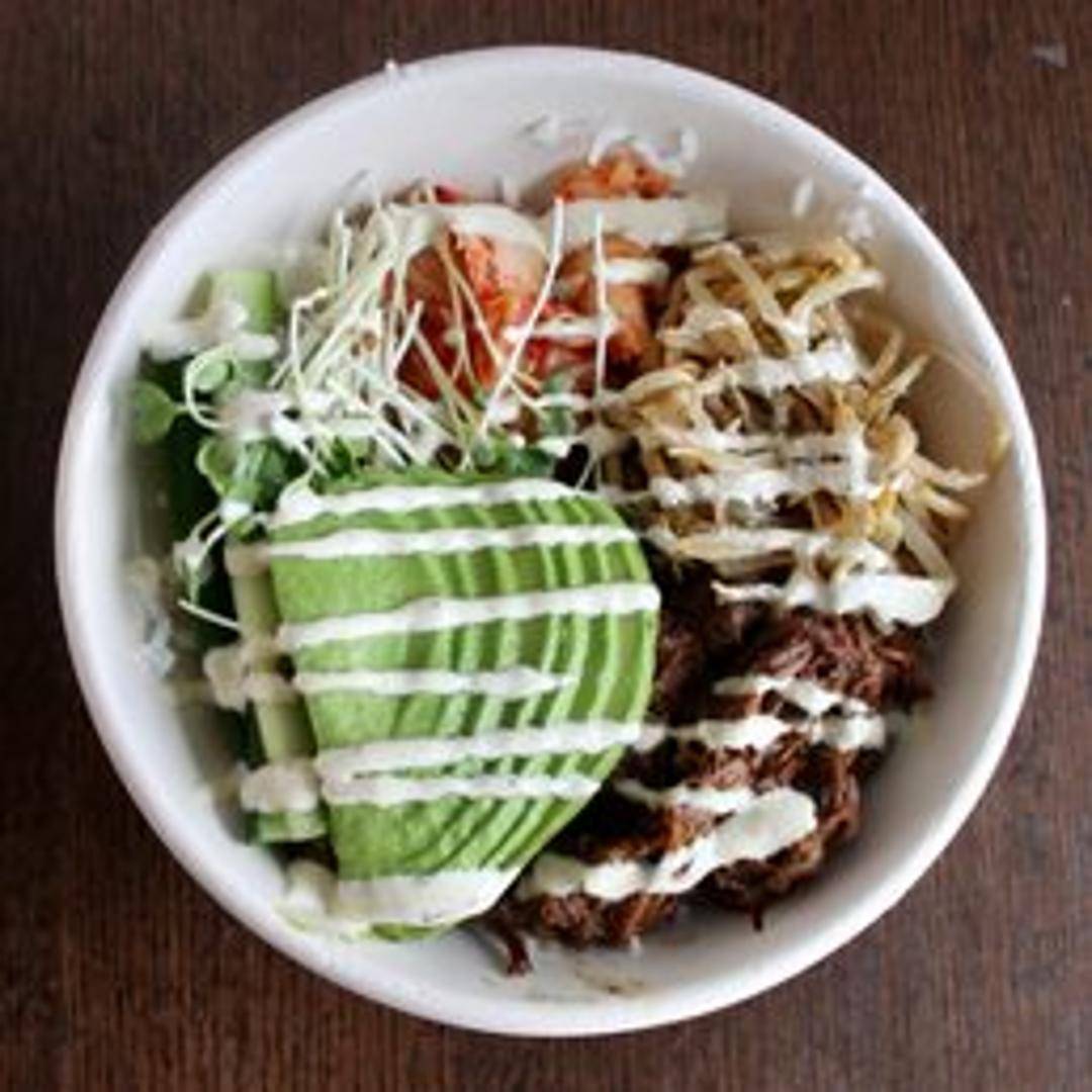 Korean-style marinated short ribs (Kalbi) served over rice with a variety of fresh and pickled vegetables, and a savory sauce.