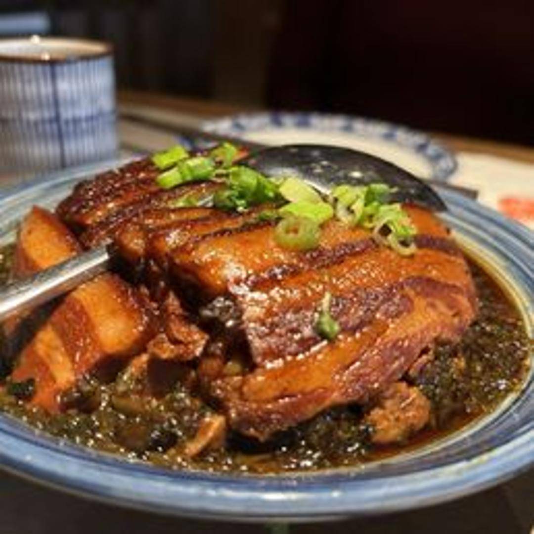 Slow-braised pork belly cooked in a rich, dark sauce until meltingly tender. This deeply flavorful dish is a comforting and savory experience, often served with rice to soak up the delicious sauce. The pork is characterized by its melt-in-your-mouth texture and balanced sweet and savory notes.